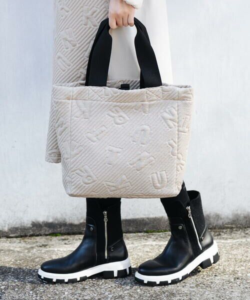 ウェアのロゴキルトジャガード素材を使用したシンプルなトートバッグ。使いやすいサイズ感とほっこりとした表面感が可愛いひと品です。持ち手部分はやや幅のあるスポーティーなテープでベージュカラーには黒、ダークグレーにはブルーの差し色配色がポイント。デイリーに活躍してくれるおすすめのアイテムです。