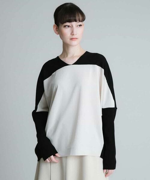 トレンド感のあるドルマンシルエットが魅力的なデザインプルオーバー。高密度のポプリン生地とレーヨンストレッチのニットをジョイントしたブラウス感覚で着て頂ける一枚になっています。袖の切り替えには長めのリブをジョイントし、折り返してボリュームをつけたりプッシュアップしてアレンンジを作れるのもポイント。春先まで活躍してくれるライトな着心地で様々なボトムと合わせて頂けます。メリハリとコントラストが特徴的でシンプルなデザインながらも存在感たっぷりの一枚です。