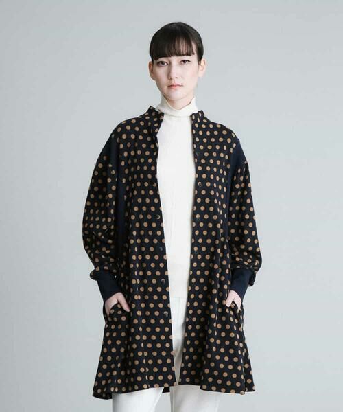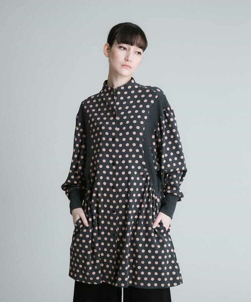 コットンベースで仕立てた肉感が丁度良いフライス素材にドットプリントを施したパーカータイプのチュニック。すっきりとしたスタンドカラーにフロントはドットスナップボタン仕様で前を開ければ羽織としても使用出来るお作りです。アームホールを大きくとってテレコ素材のリブを配した自然なギャザーがメリハリのあるシルエットに見せてくれるこだわりのディテール。ワイドスリーブでこなれ感もあり大人カジュアルなスタイリングに最適なおすすめのアイテムです。同じシリーズのトップス【RSKCU11300】【RSKCU12340】もございます。model:H170 B77 W58 H85 着用サイズ:M