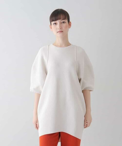 HIORKOのSSコレクションのテーマである果実の丸い形からイメージされた印象的なフォルムが特徴のひと品。非常に軽量で膨らみのあるポリエステル糸を使用したハイゲージなガーター編みが表情感をプラスします。優しく包み込んでくれるようなラウンドフォルムとホールガーメント縫製のノンストレスな着心地が嬉しい今季おすすめのアイテムです。