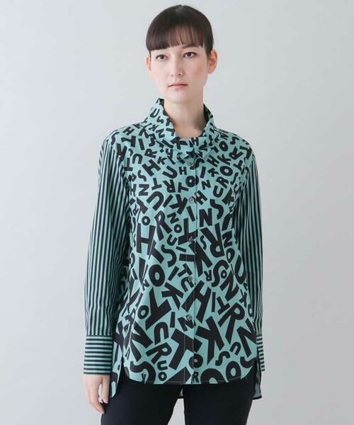 トランクのロゴとヒロココシノのロゴを組み合わせて大小のPOPなグラデーションにレイアウトしたインパクトのあるデザインシャツ。袖やバックネックにストライプを合わせるこでシャープな印象をプラス。襟元はボタンを外してベーシックに下ろしたり、上まで留めてスタンドカラーでコンパクトにまとめても着用頂けます。一枚ではもちろん、ジャケットやコートのインナーとしても最適なおすすめのアイテムです。model:H170 B77 W58 H85 着用サイズ:M