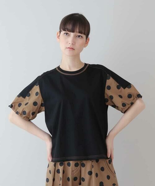 ナチュラルなカットソー素材に水玉柄のタイプライター生地をジョイントしたユニークで特別感のあるカットソー。ドロストコード入りのお袖はさらりとしたハリ感のある生地を合わせることで立体感のあるボリュームフォルムを演出してくれます。身頃はシンプルなシルエットで着心地も優しく、ステッチアクセントがスポーティーさもあるデザインに。同柄のボトム【RSHFU61390】や無地タイプ【RSHFU66360】とのセットアップでよりスタイルアップしたコーディネートをお楽しみ頂けます。無地タイプのカットソー【RSKFU65270】もおすすめ。
