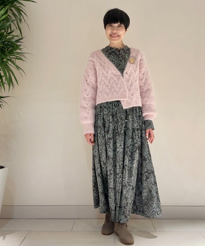 シックな配色のペイズリー柄ワンピースにライトピンクのニットカーディガンを重ねて甘さをプラス。毛足長めのシャギーな質感が温かみを感じさせてくれます。繊細なペイズリー柄なので普段プリントを着ない方もチャレンジしやすいワンピースです。さらさらとした落ち感のある素材でシーズンレスで着ていただけます。 ニット:着用サイズ/2(M) ワンピース:着用サイズ/2(M) 身長:158cm