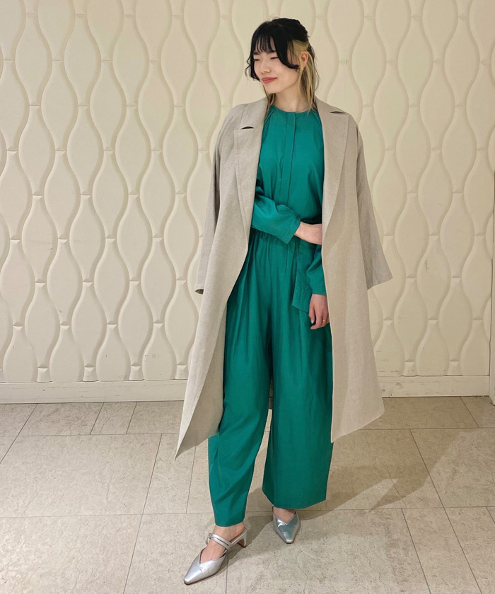 太番手のリネンをタテ・ヨコで高密度に織り上げたオックスフォード素材のコート。昨年の型をアップデートし、着丈が短くなりさらに着やすくなりました。衿を小さく、ドロップショルダーのボリュームをコンパクトに仕上げ軽やかな着心地でラフに羽織っていただけます。インにはフレッシュなグリーンのセットアップを。 コート:着用サイズ/2(M) ブラウス:着用サイズ/2(M) パンツ:着用サイズ/2(M) 身長:168cm