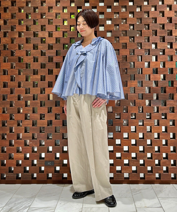 まるでケープをまとっているかのようなラッフル&フレアスリーブが目を引く華やぎブラウス。ラメ糸が織り込まれたストライプ生地は光の当たり方によってさりげなく輝きます。ほのかな透け感のある軽やかな着心地なのでボリュームがありながらもすっきりと着ていただけます。バレルシルエットのパンツと合わせて辛口なシャープさもプラス。 ブラウス:着用サイズ/2(M) パンツ:着用サイズ/2(M) 身長:160cm