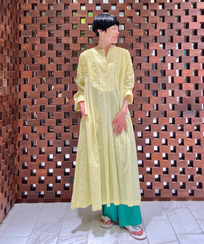 春に咲く花、ミモザを思わせるようなイエローのワンピース。ほのかに透け感のあるサッカー生地で着心地も抜群です。 胸元から肩にかけて施された立体的な刺しゅうがアクセントに。フレッシュなグリーンのパンツを重ねて、カラーコーディネートを楽しんで。 ワンピース:着用サイズ/2(M) パンツ:着用サイズ/2(M) 身長:158cm
