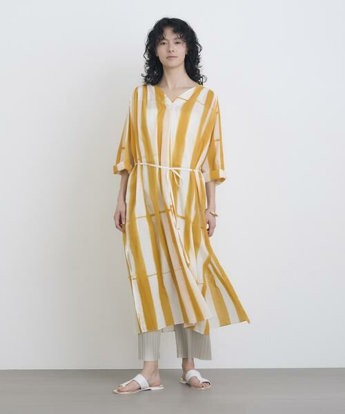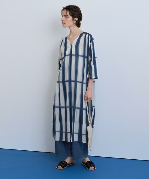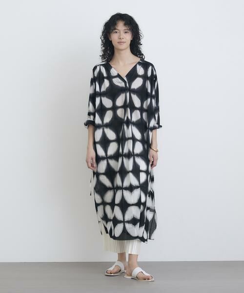 白地にジオメトリックな染め模様が目を引くカフタンワンピース。