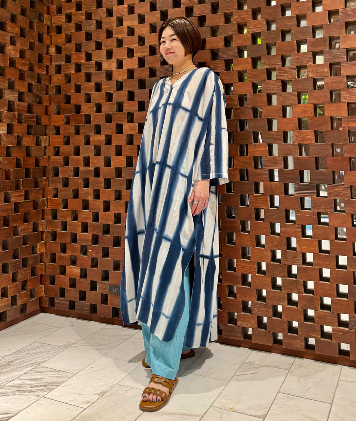 白地にジオメトリックな染め模様が目を引くカフタンワンピース。