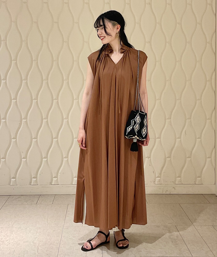 身頃にはギャザーをたっぷりと入れボリュームを出しつつ、サイドに入ったスリットで軽さを演出。足さばきの良さもデザインポイントです。