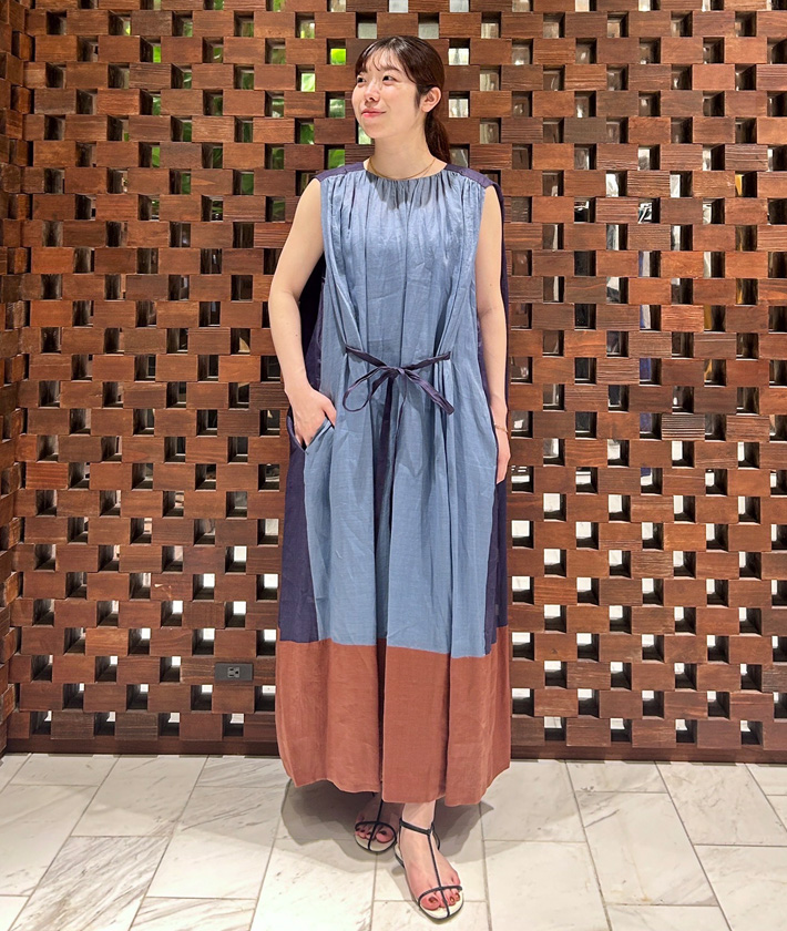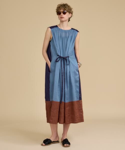 大胆なカラーブロッキングが夏のムード高まるドレス。軽やかなラミー素材が風をはらみ、清涼感のある着心地。前後左右で色の見え方が変わるので様々な表情が楽しめます。ウエストのリボンでシルエットの調整も自由自在。リボンを外して着るとよりリラクシーな印象に。 ワンピース:着用サイズ/2(M) 身長:159cm