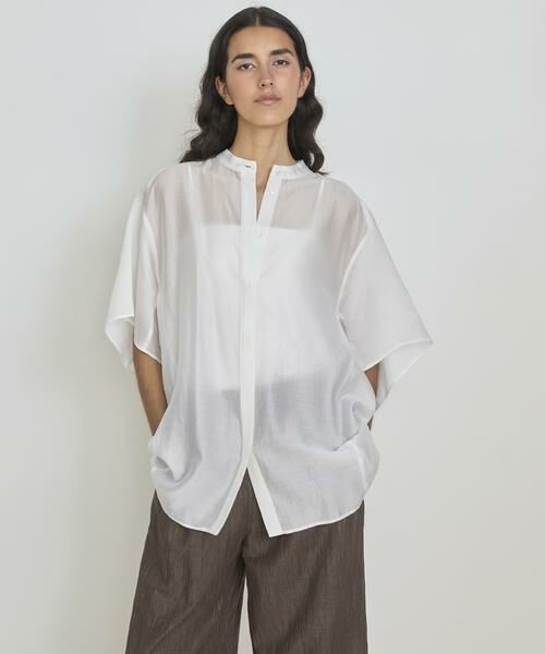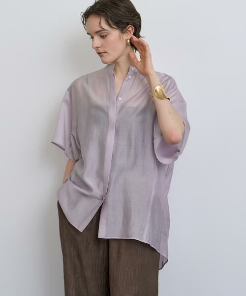 【2025 Spring&Summer】カッティングとパターンで立体的なシルエットを出したミニマルなデザインのスタンドカラーシャツ。脇にマチを入れることでよりフォルムを感じられるデザインです。羽織りとしてもおすすめの1枚。なめらかな光沢が特徴のフィラメント糸を使用することで程よいシャイニー感を表現。透け感のあるライトウエイト素材にバイオ加工を施し、よりパウダリーでソフトな風合いに仕上げました。**********************透け感:ややあり裏地:なし伸縮性:なし光沢感:あり生地の厚さ:薄い生地の重さ:軽いポケット:なし手洗い:可**********************【モデル】身長:176cm 着用カラー:オフホワイト、ブラウン身長:177cm 着用カラー:ラベンダー