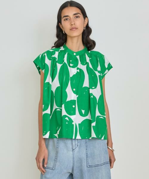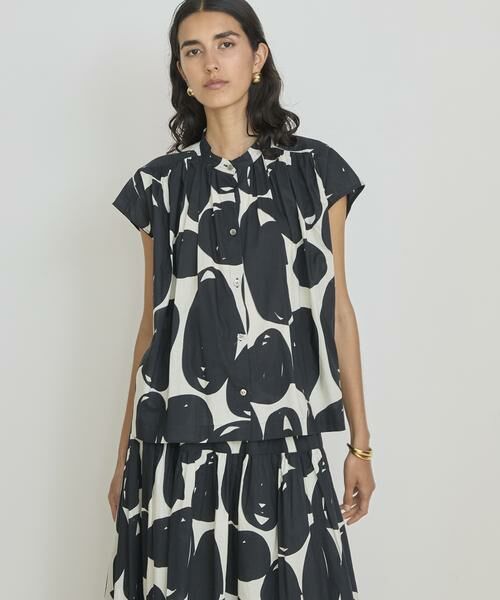 モダンアートの様な大胆なタッチのドットをプリントしたスタンドカラーブラウス。