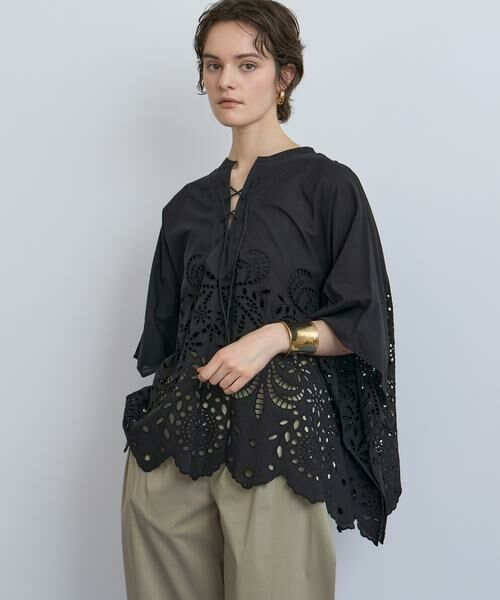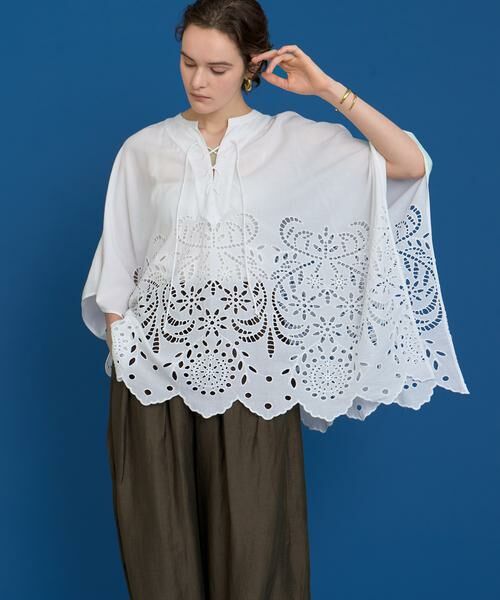 フロントのレースアップをアクセントに、軽やかに揺れる裾のスカラと、華やかなカットワーク刺繍が、ラフな着心地ながらも一枚で様になるアイテムです。