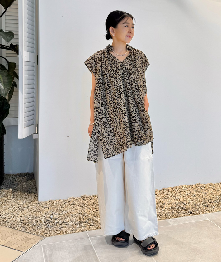 サッカー調の凹凸感がある素材で肌離れがよく、猛暑の夏も快適に過ごせるノースリーブブラウス。襟元のフリルがアクセント。前後に入ったギャザーとサイドのスリットにより軽やかな着こなしに。 ブラウス:着用サイズ/2(M) パンツ:着用サイズ/1(S) 身長:149cm