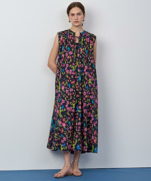 黒地に多色の鮮やかな花柄が映える、ギャザーをたっぷり入れたノースリーブワンピース。