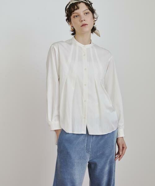 衿ぐりから放射線状にタックのプリーツをいれたデザインブラウス。