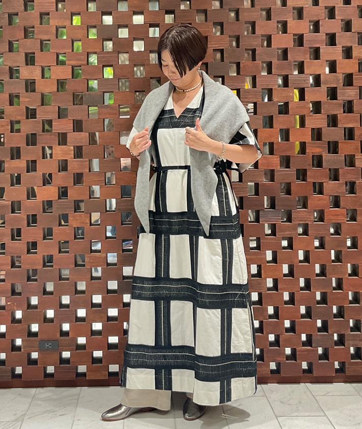 Vカラーのサックワンピースにトライアングルストールをさらりと巻いて。大判のストールは朝晩の気温差が激しい今の時期に一枚あると重宝するアイテム。モノトーン×ライトグレーのニュートラルな配色がシックな雰囲気に。 ワンピース:着用サイズ/2(M) 身長:160cm