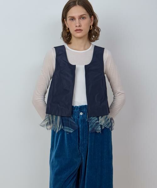 光沢のあるポリエステルコットンのボディに、シルクフリルをドッキングしたジップアップジレ。