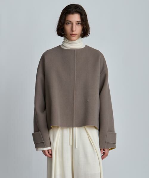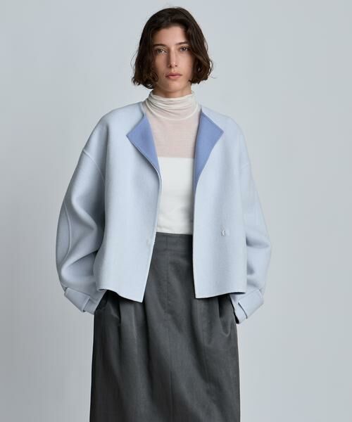 リバー仕立てのバイカラーショートコート。