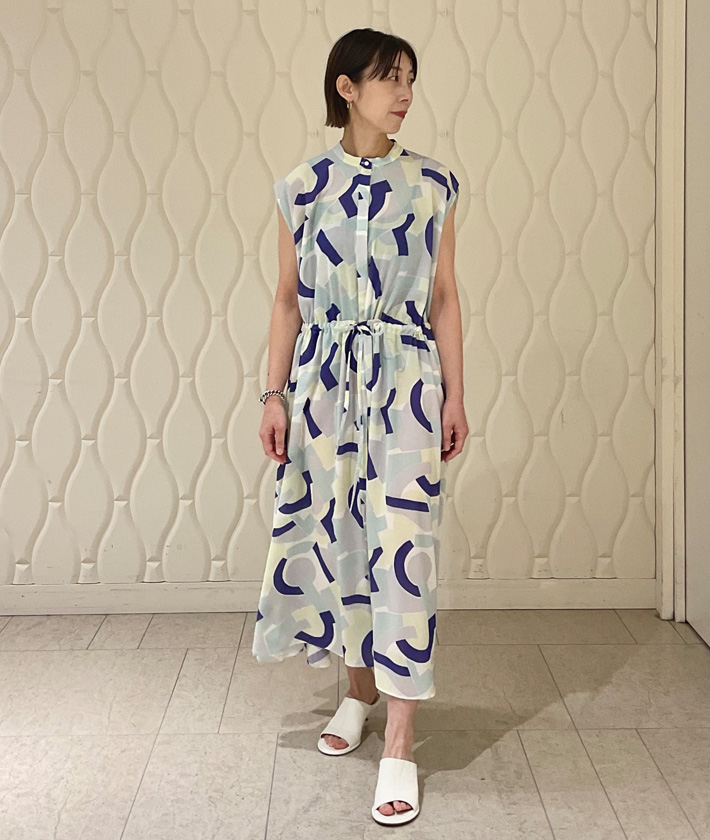 モダンアートを思わせるジオメトリックプリントのワンピース。涼し気なペールトーンをベースにパープルを利かせてアクセントに。ウエストはドローコード仕様になっていてシルエットの変化を楽しめます。落ち感のある素材ですっきりと着ていただけます。フロントのボタンをすべて開けて羽織りのようにもアレンジ可能。 ワンピース:着用サイズ/2(M) 身長:171cm