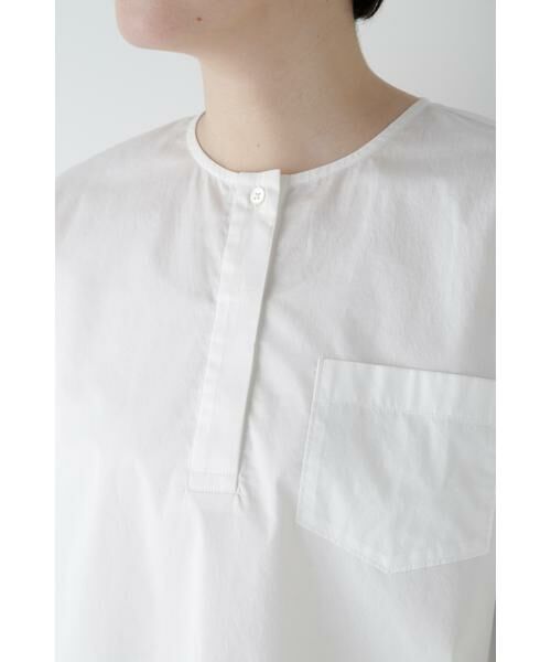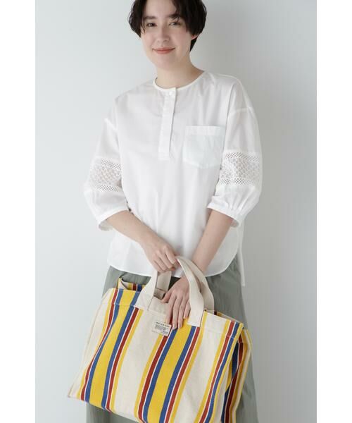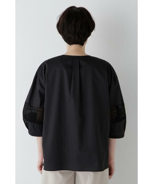 ラッセルレースがエアリーな雰囲気を演出するドッキングブラウス【デザインのポイント】フォルムを付けたハーフスリーブにボーダーラッセルレースを切り替えたノーカラープルオーバーです。【素材のポイント】細番手の綿糸を高密度に織り上げ、ふくらみの出るワッシャーで仕上げたハイカウントツイルを使用しています。袖の切り替えはケミカル風に仕上げた幾何学柄のラッセルレースです。【おすすめコーディネート】一枚着として存在感のあるトップスです。デニムなどカジュアルなボトムと合わせても華やかなスタイリングに仕上がります。透け感/なし|裏地/なし|光沢/なし|生地の厚さ/普通|伸縮性/なし|シルエット/スタンダード
