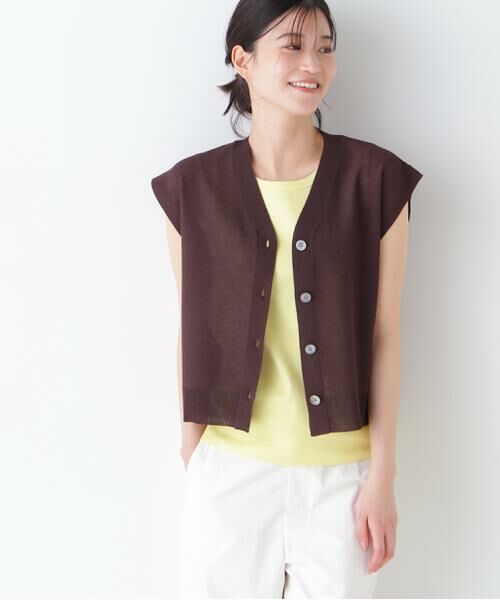 鹿の子組織で地柄感のある前開きのベスト。Vネックのラインが大人っぽい印象です。インナーにタンクトップを合わせて襟元をレイヤーしていただくと肌見せ感を調整できます。