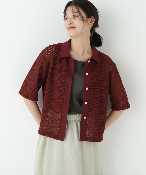 クロシェ風のレースを使ったシャツ襟付きの羽織り。衿と前立ては天竺カットソーを使用。レースのボリューム感が目を惹くスタイリングのポイント使いになるアイテムです。。