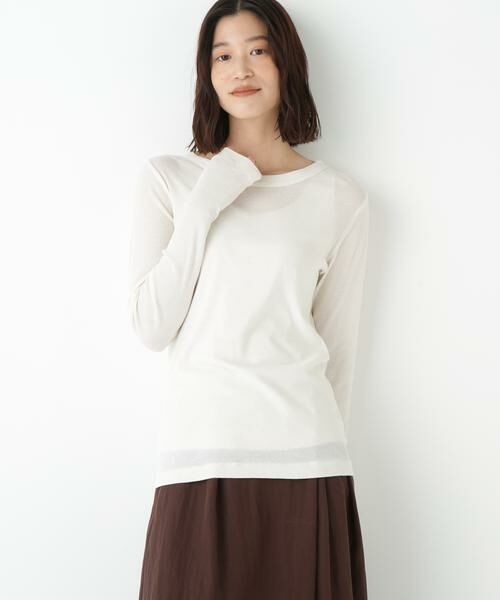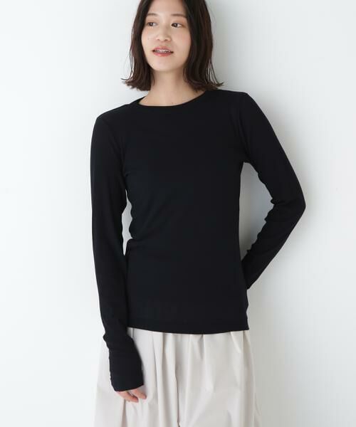 薄手で柔らかく伸縮性があり、着用感が気にならない素材です。優しい肌触りなので冬ニットのちくちく対策にもおすすめ◎ インナーとしてレイヤードしても首周りはすっきり見え、袖口のおしゃれも楽しめます。
