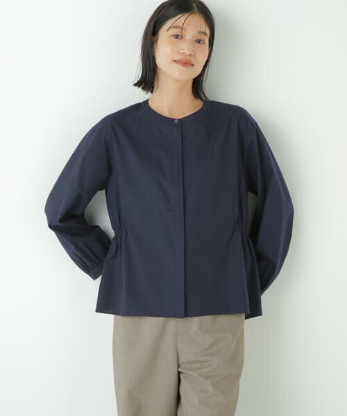 上品でリラックス感のあるシルエットが魅力のノーカラーブラウス