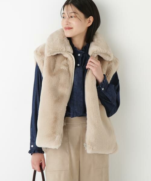 大きめ衿がキャッチーなフレンチスリーブフェイクファージップジレです。毛足で目立たないように後ろ身頃に切り替えとタックを入れて程よいコクーンシルエットを表現しています。ファスナーを噛まないように前端にコットンテープを施しています。