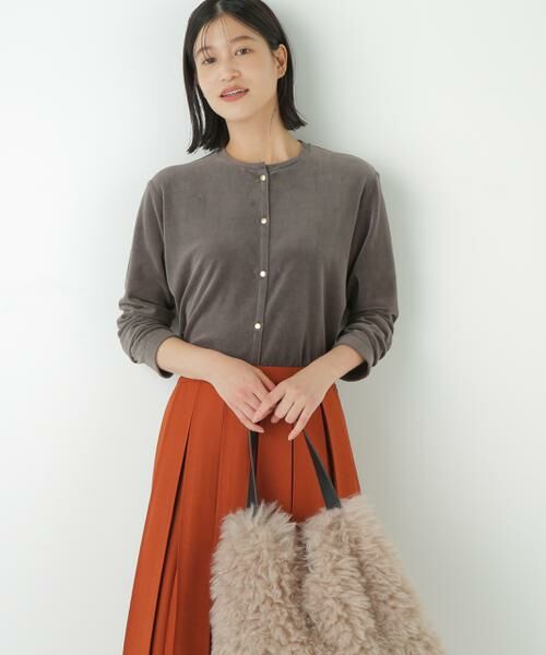 しなやかな起毛感のある素材で羽織るだけで季節感を感じられる一枚です。幅広いボトムとバランスのいい丈感に仕上げています。今期はプリントスカートとのスタイリングがおすすめです。