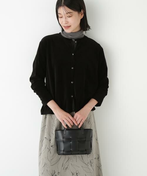 シンプルなボックスシルエットのベロアカーディガンです。前立ての裏にグログランテープをつけ、メタル釦でキレイ目に仕上げてあります。