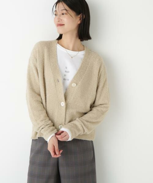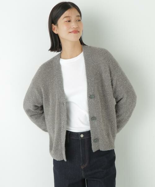 表情豊かなラメシャギーが目を惹くVネックカーディガン【デザインのポイント】馴染みの良いラメ糸が入ったファンシーヤーンで編み立てたVネックのカーディガンです。 ショート丈で今年らしいバランスに仕上げました。大きめのボタン使いもポイントです。【素材のポイント】キラキラ輝く光沢のある細い糸がベースの糸に撚糸されて特徴的な表情になっています。柔らかいタッチで軽いです。カラーはグレーにシルバーラメ、ベージュにゴールドラメと肌馴染みも良いです。【おすすめコーディネート】Tシャツやカットソーなど、シンプルなトップスに合わせるだけでコーディネートが決まる存在感のある一枚。デニムなどカジュアルなアイテム合わせもおすすめです。透け感/なし|裏地/なし|光沢/ややあり|生地の厚さ/普通|伸縮性/ややあり|シルエット/スタンダード