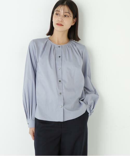 ネック部分にニュアンスあるランダムタックを施した前開きクルーネックブラウスです。すっきりとした肩幅からの程よいボリューム袖もポイントです。