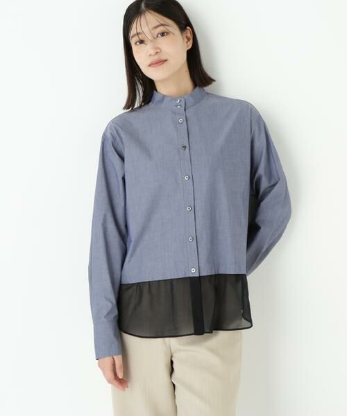 身頃は程よいワッシャー感のあるオーガニックコットンシャツ地です。裾の別布にはドライ感とハリ感を持つ上品なコットンオーガンジーを使用しています。