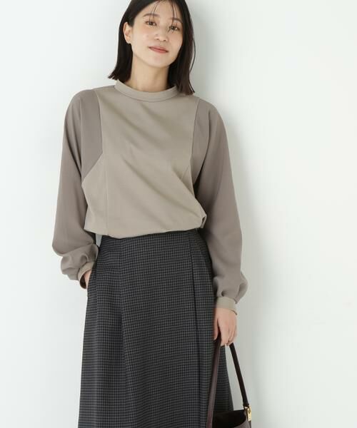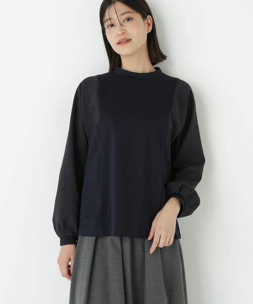 モックネックの袖異素材ドッキングなトップスです。キレイ目素材のドッキングなのでオンのシーンにも活躍するデザインです。