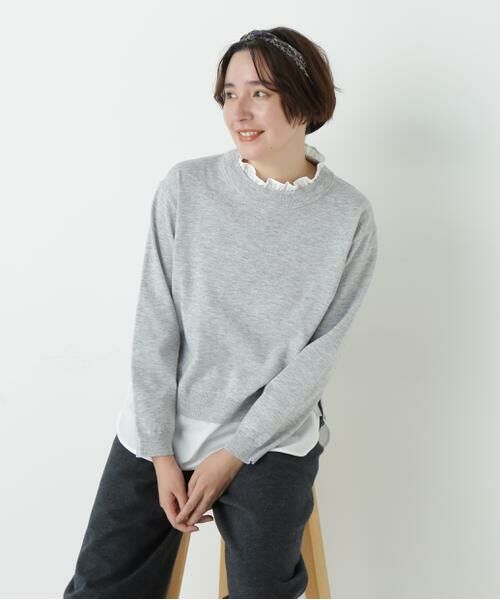 一枚で様になる、フリルブラウスを重ね着したような布帛ドッキングニット【デザインのポイント】フリル襟ブラウスを重ね着したようなデザインの布帛ドッキングニットです。襟元と裾からのぞく布帛が価値観のあるデザイン。襟は取り外し可能なので、シーンに合わせて印象を変えていただけます。【素材のポイント】ウール混の薄手ニット。さらりとした着心地で長いシーズン着ていただきやすい肉感です。【おすすめコーディネート】1枚で様になるデザインニットなので、シンプルなボトムと合わせるだけでスタイリングが完成するのが嬉しいポイントです。透け感/なし|裏地/なし|光沢/なし|生地の厚さ/普通|伸縮性/ややあり|シルエット/スタンダード