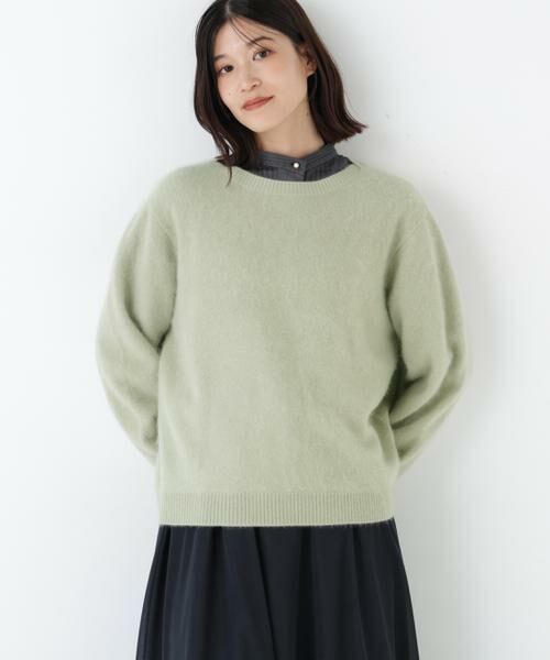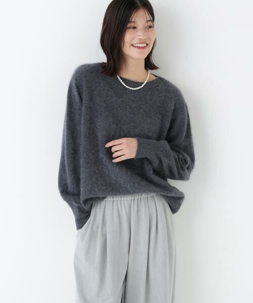 ファー加工を施したボリューミーな風合いのニットプルオーバーです。変形のクルーネックで襟元が単調にならないようにしました。