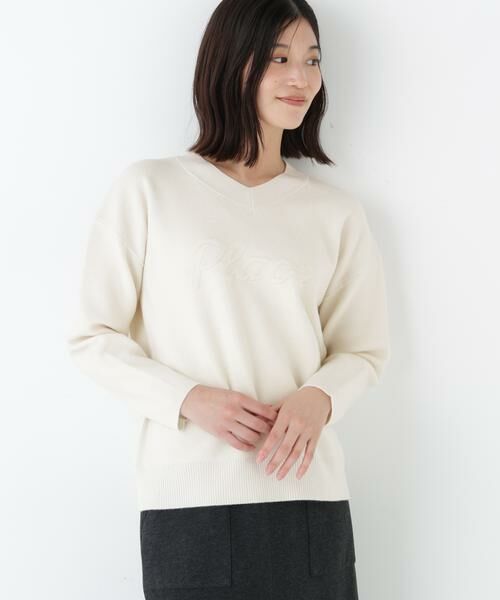 立体的なジャガードの手法を使ったロゴニットです。筆記体で書かれた「Place」はフランス語で場所、広場という意味です。衿は浅めのVネックでクルーネックやタートルインナーを重ね着しても可愛いです。