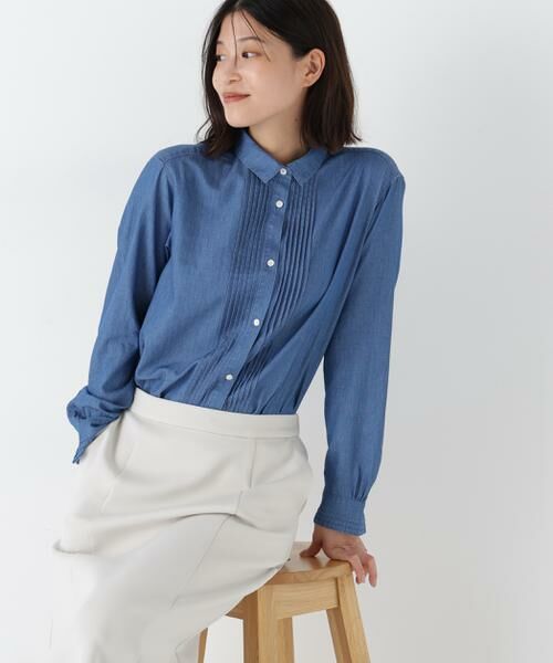 ・お届け予定日:1月下旬頃ピンタックデザインが映える大人のデニムブラウス【デザインのポイント】とても薄いデニム生地でおつくりしたピンタックブラウスです。胸元とカフスのピンタックをポイントにして、ブランドらしい小さめの衿で仕上げてあります。サイズ感は程よく肌離れするゆとりがあります。【素材のポイント】3ozというかなり細番手の糸で織り上げたデニム素材を加工の違いで2色展開しています。【おすすめコーディネート】ニットやスウェットのインナーとしてもレイヤードできるデニムシャツなので、インナーとして、また暖かい季節には1枚着としても活躍するブラウスです。透け感/なし|裏地/なし|光沢/なし|生地の厚さ/普通|伸縮性/なし|シルエット/スタンダード