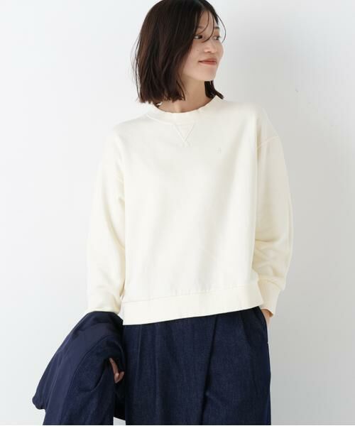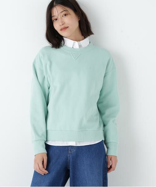 裏毛スウェットに「h」刺繍を同色で施した春カラースウェットです。衿下のガゼットデザインでカジュアル感があり見頃は横地の目使いにしています。