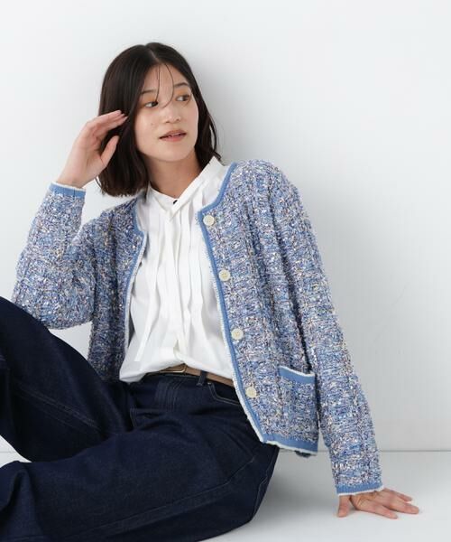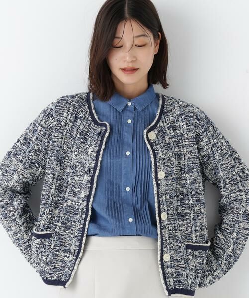 様々な意匠糸で編立てた表情豊かなニットジャケットです。襟ぐりから前端などの配色パイピング使いが柄を引き締めてスッキリ見えます。