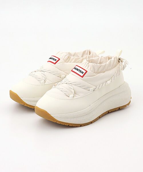 防水性と滑りにくいグリップ力を兼ね備えたハンターグリップ シリーズに、スリッポンシューズが登場しました。Hunter独自に開発した滑りにくいアウトソール、”Hunter Grip(ハンターグリップ)”を使用した、このスリッポン トレーナーは凍った路面でも、滑りにくい優れた防滑機能を搭載しています。軽量で、-22℃の環境まで対応する高い保温性と、防水性も兼ね備えており、寒さの厳しい冬のレジャーにも最適な一足です。脱ぎ履きがしやすいトレーナータイプのため、雪の日の車移動の際などの使用にも適しています。アッパーにはリサイクル素材を使用しています。