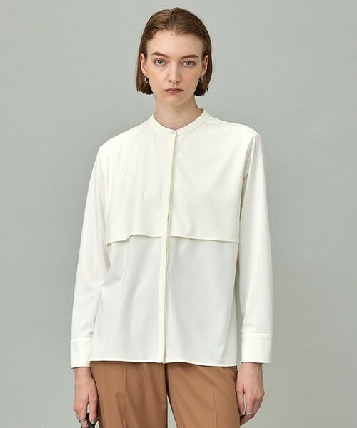 ■デザイン大きめのフライヨークがポイントのバンドカラーカットソーです。暑さの残るこの時期にサラッとした肌触りが特徴で、一枚着はもちろん、ジャケットのきれいめインナーとしても活躍します。シワになりにくく、イージーケア素材なのも嬉しいポイントです。※モデル着用画像はサンプルを使用しています。実際は、前立てのヒヨクの開きが右左逆向きになります。商品詳細の画像が正しい向きとなります。予めご了承ください。