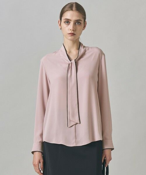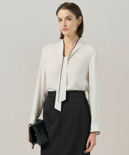 ■デザインバイカラーの配色トリミングを効かせたボウタイの長袖ブラウスです。単品でもジャケットのインナーとしてもスタイリングのポイントになるデザインに仕上げています。単品はもちろん、スーツやジャケットのインナーとして通勤やセレモニーシーンにも活躍します。