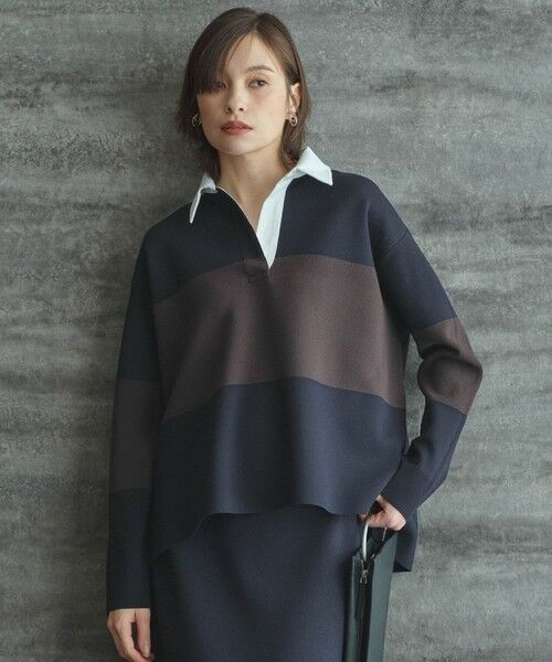 ■デザイントレンドのラガーニットをICBらしくモードに再解釈し、微光沢なエッジの効いた表面感で大人カジュアルに仕立てました。程よい抜け感のあるリラクシーなボディーと、ラガーニットを思わせるシャープなスキッパー衿が特徴のプルオーバーです。衿部分に布帛素材を使用したコンビデザインもポイントになっています。緩さがありつつも微光沢な表面感で凛としたモードな佇まいを演出してくれる一枚で、細かな綾目の中に光沢感もあるので、カジュアルになりすぎない印象です。前後差のあるレングスに脇はスリットで軽さをプラス、フロントインの着こなしもおすすめです。同シリーズのタイトスカートと合わせてセットアップでのスタイリングも楽しめます。