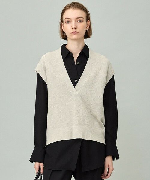 ■デザインスタイリングの鮮度をぐっと引き上げてくれるニットベスト。ブークレヤーンに綿糸をブレンドしダブルジャガードに編立て、しなやかな質感の中にスポンディッシュでエアリーなタッチをプラスしました。シャープに深く開いた重ねVネックラインがポイントで、程よく抜け感がありつつも合わせるインナーをモードに昇華してくれます。シアートップスのレイヤードや、タンクトップ合わせでヘルシーなスタイリングもおすすめです。