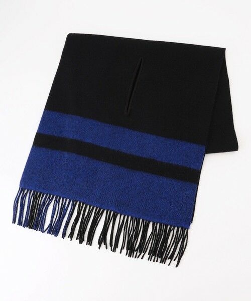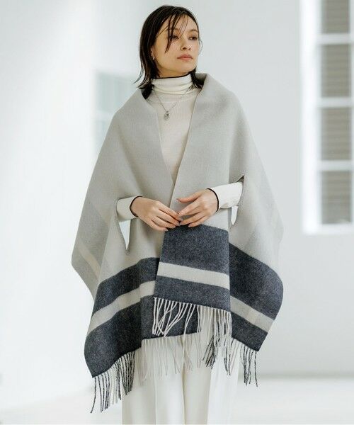 ■デザイン表裏両面お使いいただける大き目ストールです。ウール100%のふっくらとした厚みのある素材で、アイレット部分に手を入れると羽織のようにすっぽりと体を包み込んでくれる仕様です。オフィスや移動中など、膝掛けとしてもお使いいただける大きさと厚みがポイント。温度調整の難しい時期に、とても役立つアイテムです。表と裏でライン柄が異なるため、スタイリングや気分に合わせて好きな面で楽しんでいただけます。