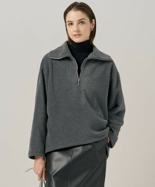 ■デザイン程よくゆとりを持たせたリラックスシルエットのハーフジッププルオーバーです。軽さとふくらみのある表情感で、きれいめスタイリングの外しアイテムとして使える一枚です。身幅に余裕のあるシルエットなので、季節に合わせてインナーにロングスリーブTシャツやシャツブラウスなどを重ねて、様々なレイヤードコーディネートを楽しめます。前後差のある裾にはドロストコードを入れているので、絞りを調節してフォルムのアレンジも可能です。ジップのカラーはミディアムグレー(003)とネイビー(075)がシルバー、ブラック(005)がゴールドです。
