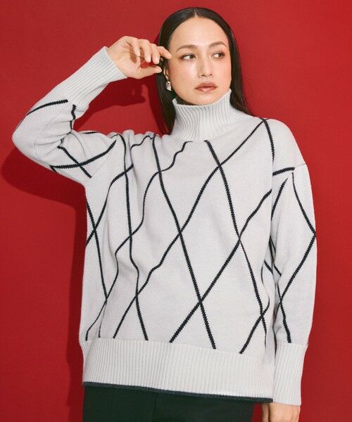 ■デザインオーセンティックなアーガイル柄をICBらしくモードに再解釈し、ラインのみで構成したミドルゲージの袋ジャガードのハイネックニットです。縦長のダイヤ柄がリズミカルに配置されることで、シャープで洗練された印象に。ふんわりと体を包み込むリラクシーなシルエットで、パンツスタイルはもちろん、スカートにも合わせやすく秋冬のスタイリングの主役になるアイテムです。